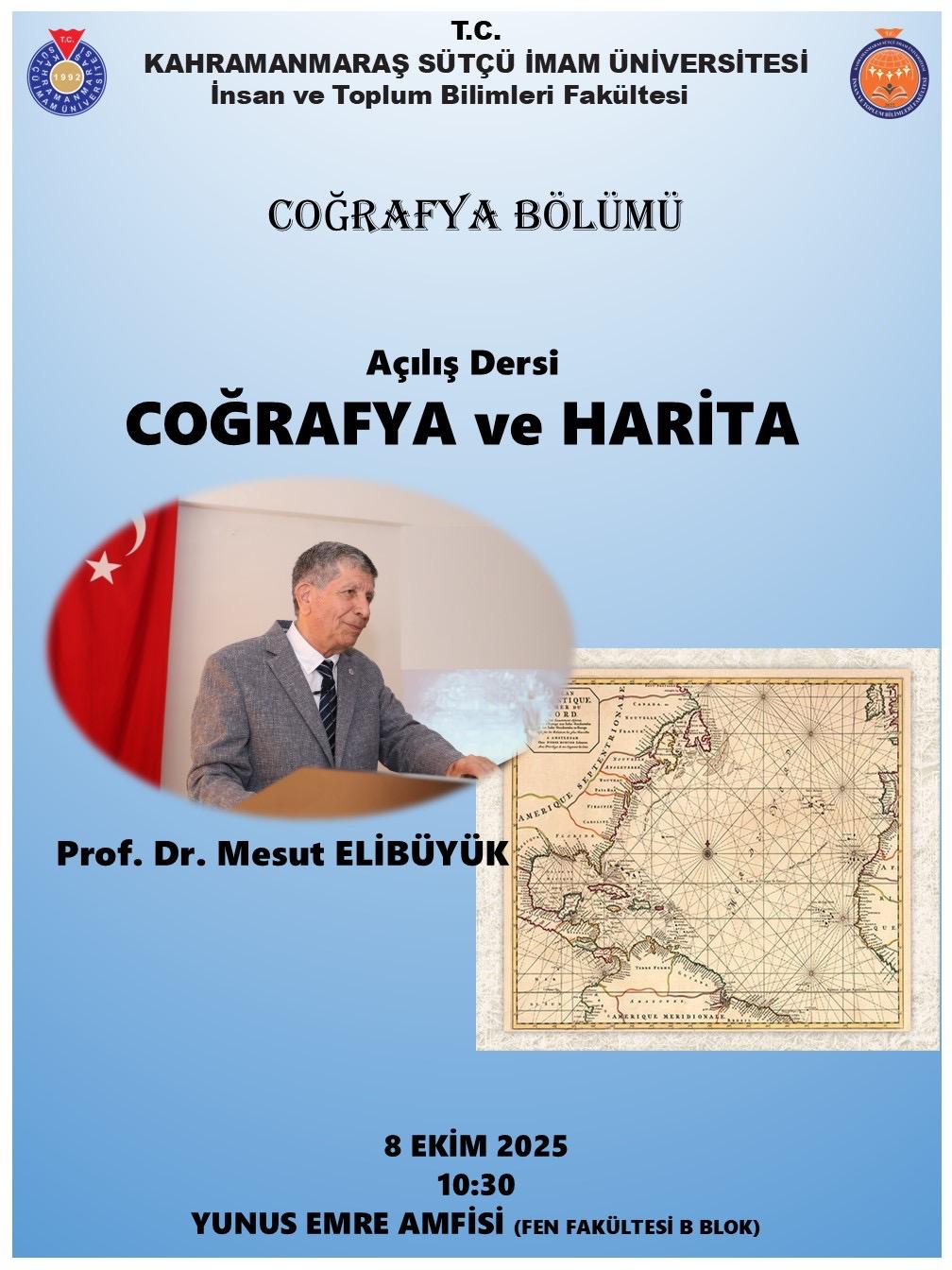 Tarihi Coğrafya alanında uzmanlaşmış olan kıymetli hocamız Prof. Dr. Mesut ELİBÜYÜK, "Coğrafya ve Harita" konulu konferansı vermek üzere Kahramanmaraş´a geliyor. Konferans, 8 Ekim saat 10.30´da Yunus Emre Amfisinde (Fen fakültesi B Blok) yapılacaktır. Öğrencilerimize duyurulur.